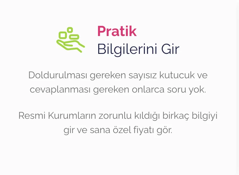 Anlaşmalı olduğumuz 20+ sigorta şirketinin müşterilerimize özel hazırladığı teklifleri fiyat ve teminatlar açısından puanlayıp öneriler hazırlıyoruz. Bu sayede müşterilerimiz teklifler arasından; en ucuz fiyata sahip ürün, fiyat/performans skoru en iyi olan ürün ve en kapsamlı teminat içeriğine sahip ürünü kolayca seçebilir. Uzun süren incelemelere gerek kalmadan ihtiyacına en uygun poliçeyi hızlıca bulur ve güvencesini başlatır.